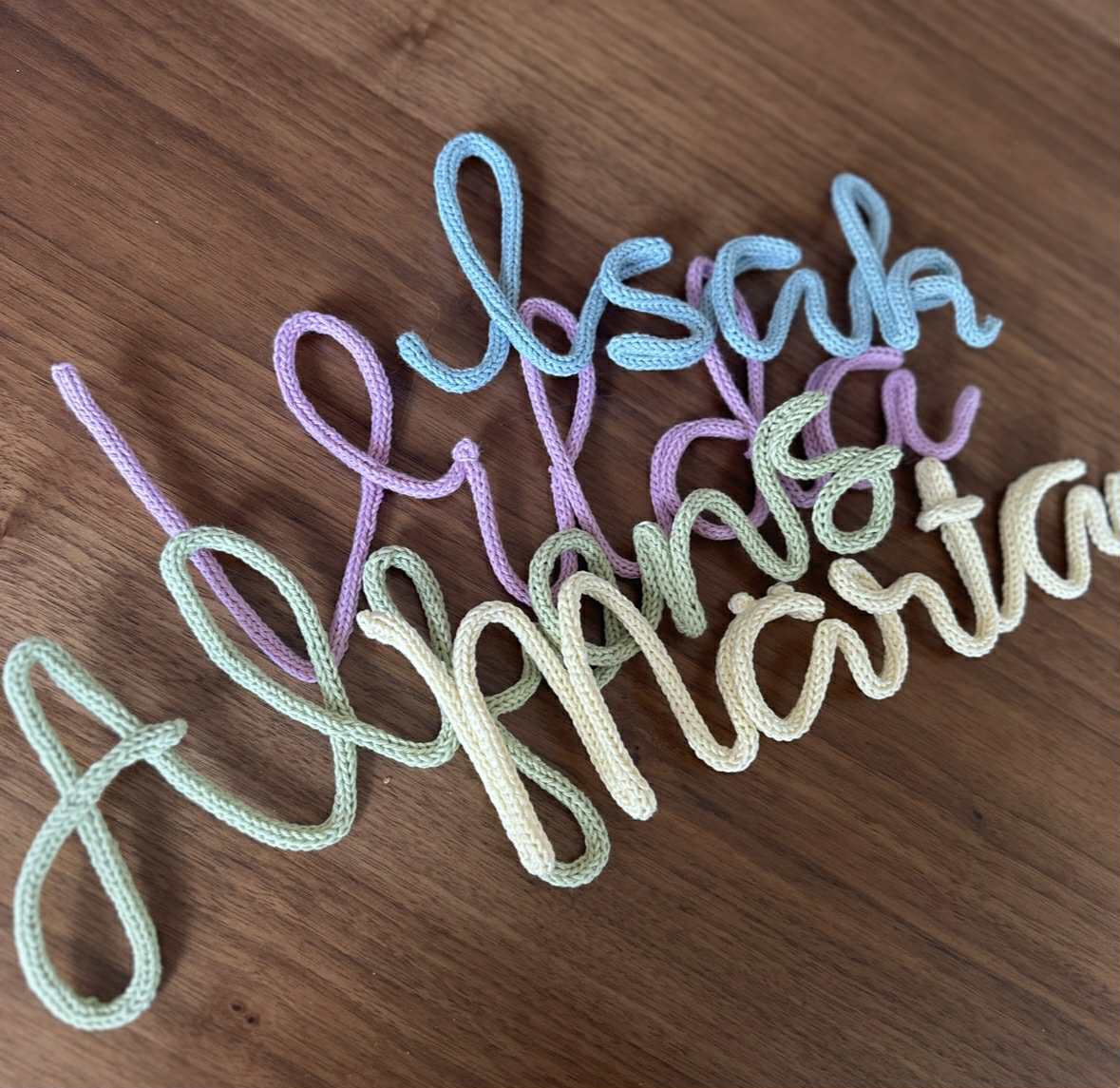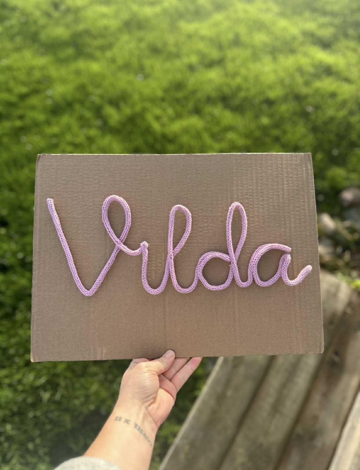 Namnet formas i ett sammanhängande rep med mjuka linjer och tydlig läsbarhet. Resultatet är en dekor som funkar lika bra i barnrum som i hall, ateljé eller som present.