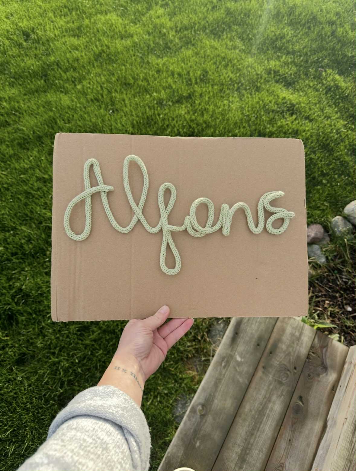 En personlig namnskylt formad av kraftigt naturrep, monterad på en stabil trä- eller kartongbas. Varje skylt görs för hand efter ditt önskade namn, vilket gör varje exemplar unikt.